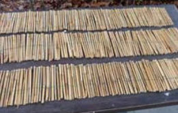 Für Schilfhalme werden Schilfmatten aus dem Baumarkt bezogen und in Wasser eingeweicht. So lassen sich die Matten am besten mit einer scharfen (!) Gartenschere in jeweils 15 cm lange Abschnitte schneiden. Wenn das Schilf splittert, wird dieser Eingang von Wildbienen verschmäht. Zum Schluss werden die getrockneten Schilfmatten aufgerollt und ebenfalls fest zusammengebunden.